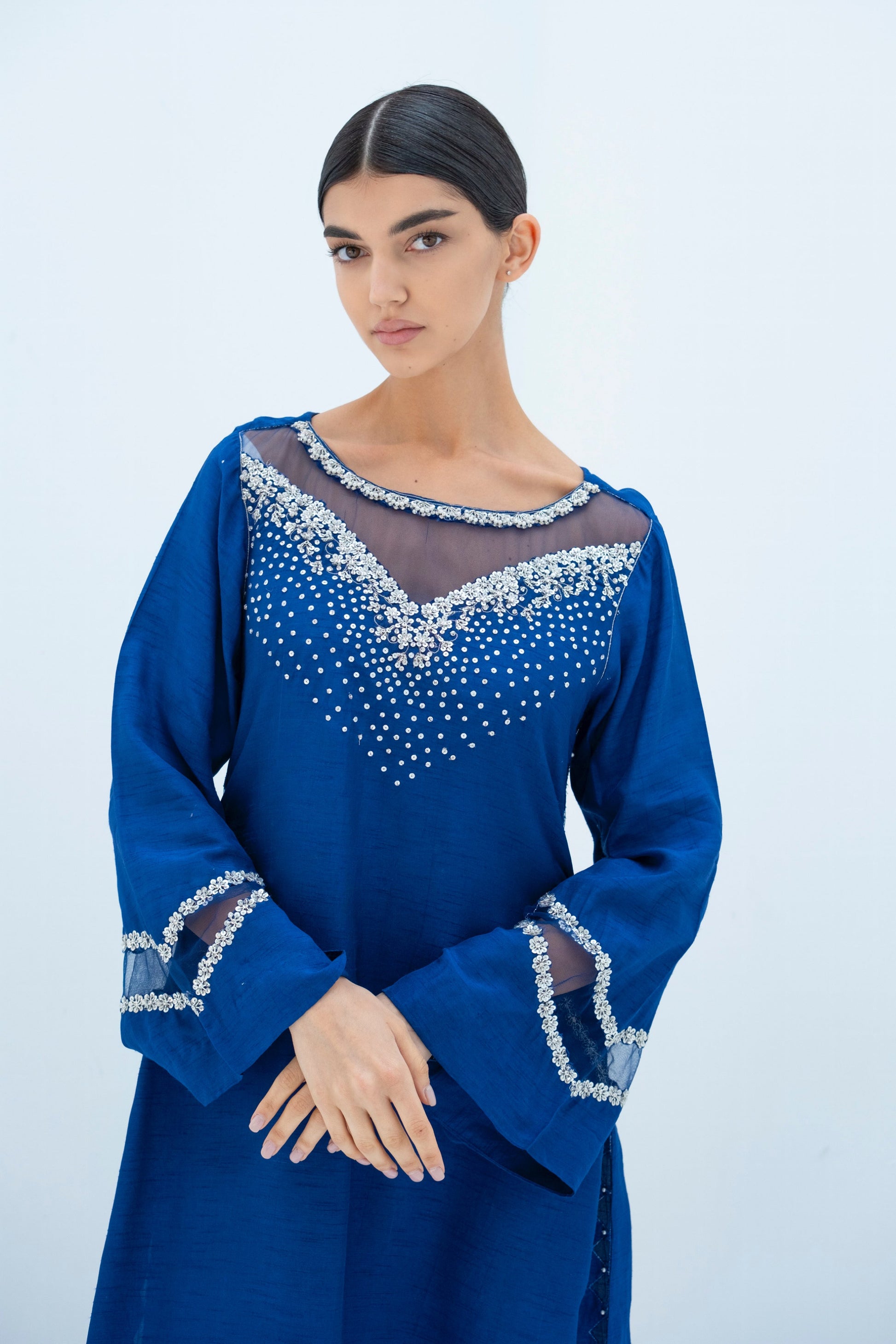 A regal kaftan featuring a sheer embellished neckline, intricate beadwork cascading down the bodice, and elegantly detailed sleeves, exuding sophistication and charm.