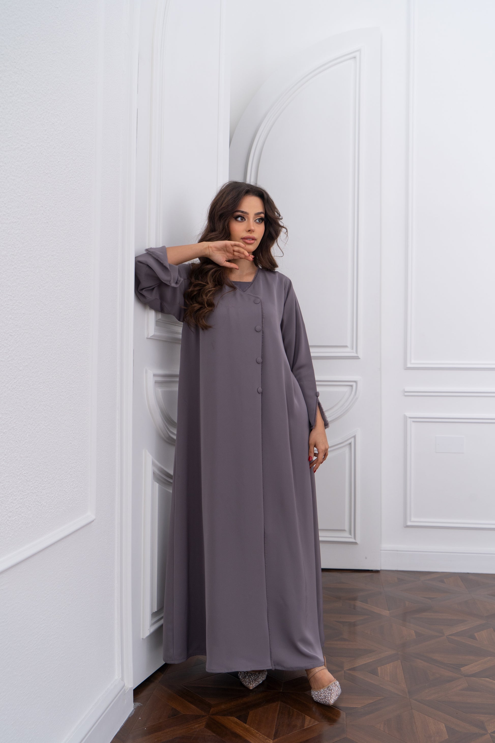 Crafted from light crepe,the design flows effortlessly across a relaxed two- piece silhoutte, offering a quiet sophistication for everyday wear.