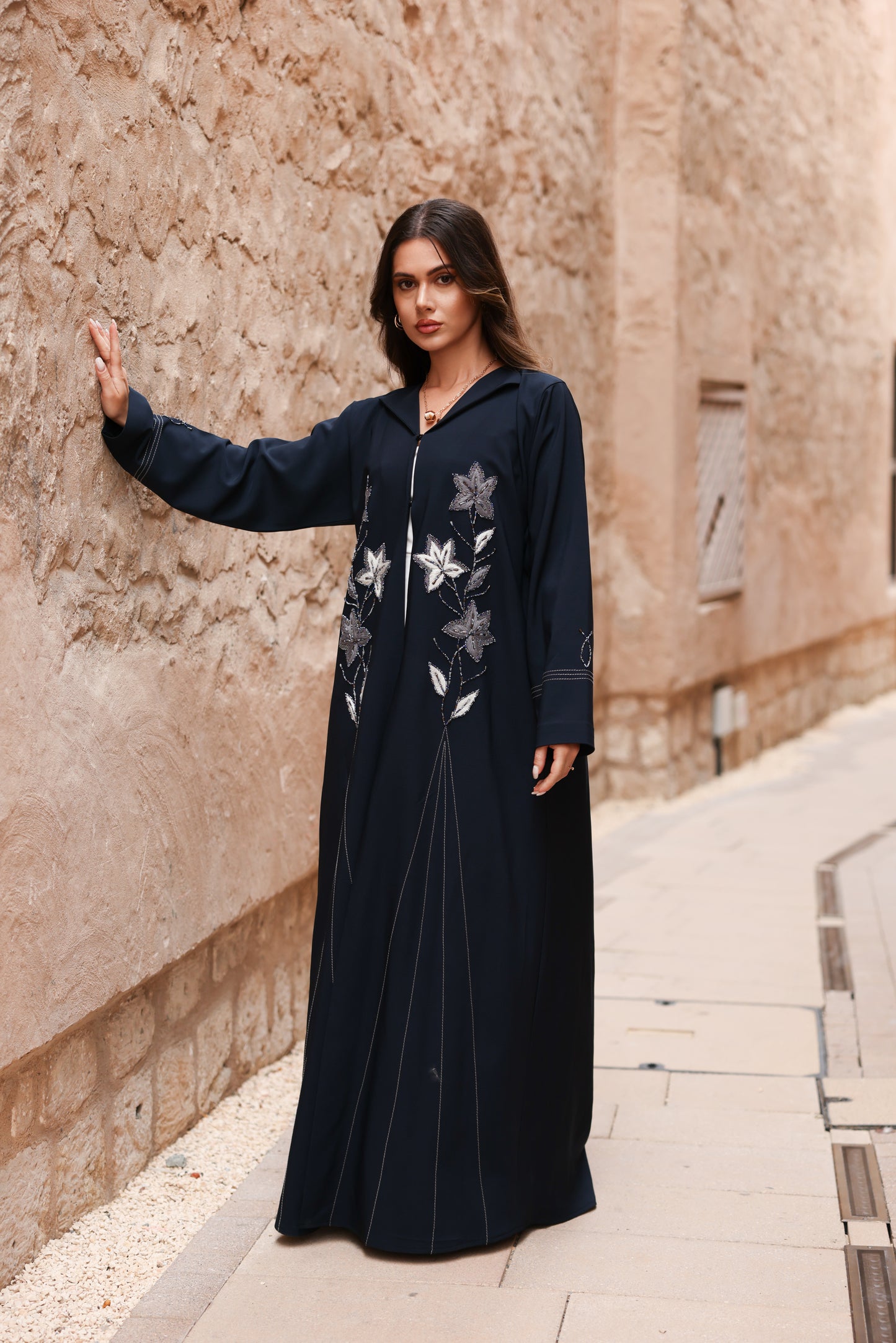 This navy-blue abaya exudes elegance with its intricate floral embroidery and shimmering embellishments, creating a refined and sophisticated look.