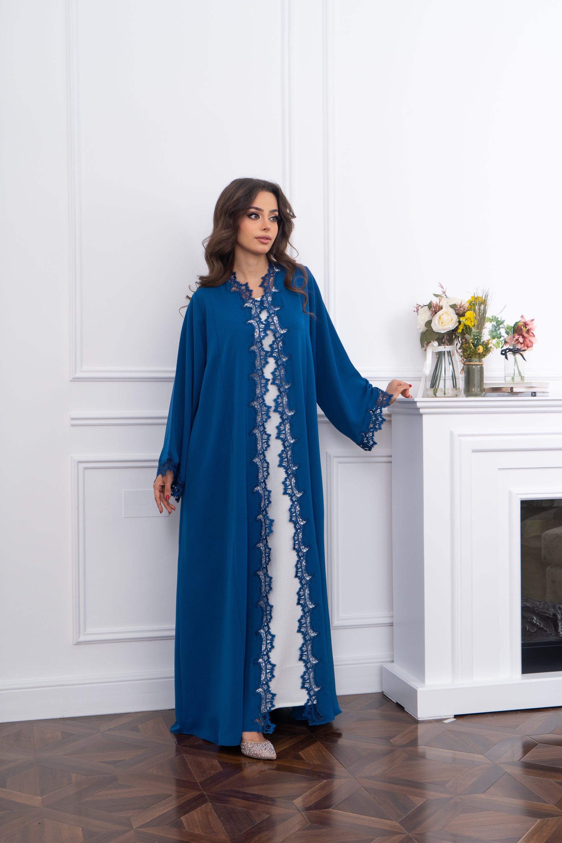 Luxurious crepe lends fluid movement and structure,. Refined lace detailing adds a delicate feminine finish. A polished two piece ensemble with enduring appeal.